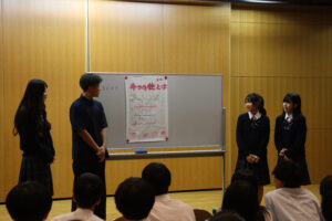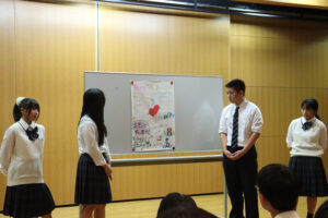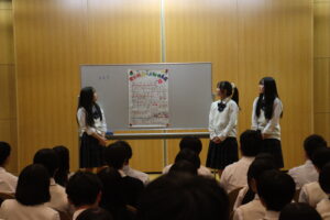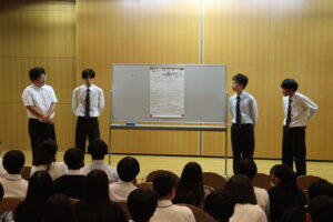 各クラスからの代表チームが1年生総合進学コース全生徒の前で発表を行いました。
