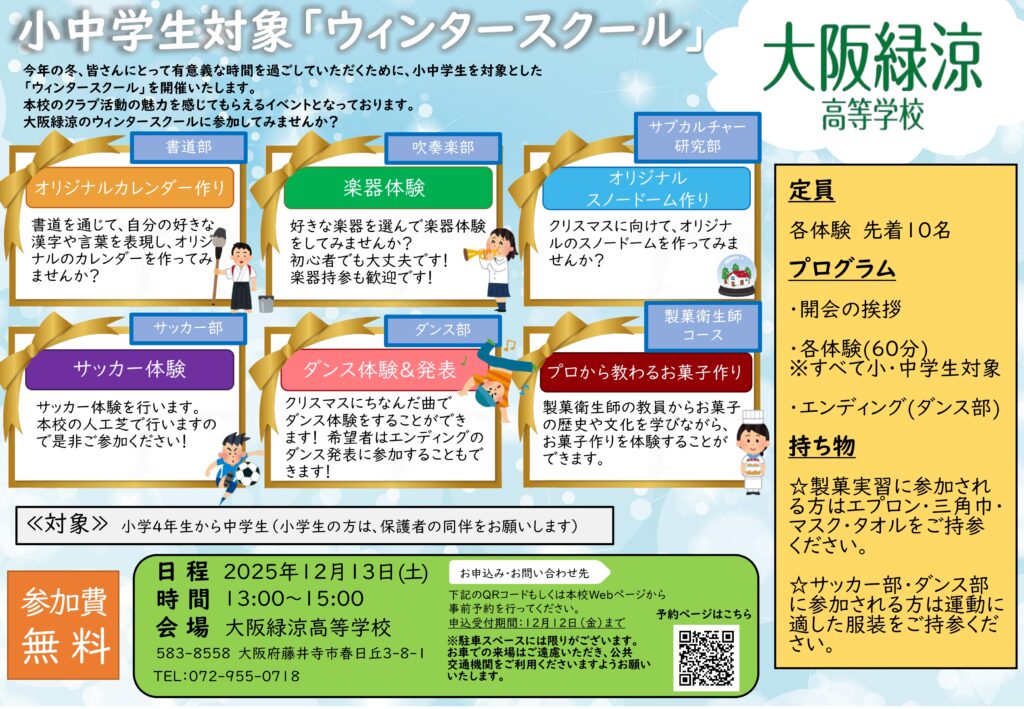 12月13日(土)13時~15時に本校にて小中学生対象「ウィンタースクール」を開催いたします。
