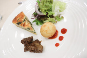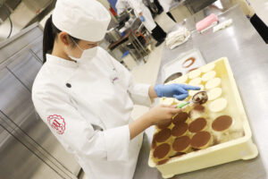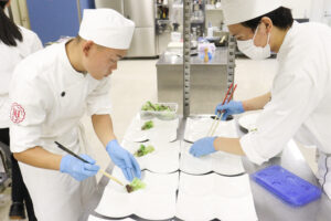 実習では、学生たちが厨房とサービスの役割を分担し、実際のレストランさながらの運営を行います。各セクションに分かれてコース料理を提供し、実際のレストラン業務を行います。