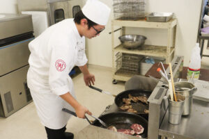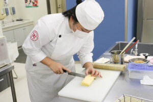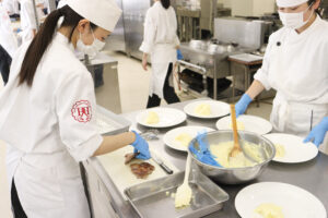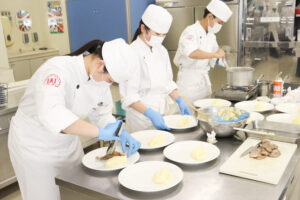 実習では、学生たちが厨房とサービスの役割を分担し、実際のレストランさながらの運営を行います。各セクションに分かれてコース料理を提供し、実際のレストラン業務を行います。