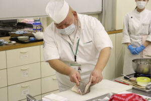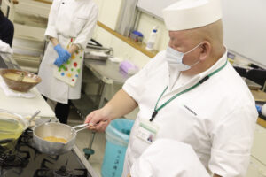 本校教諭による学校紹介の後、調理の体験授業を受けました。その後、施設見学と食堂体験を行いました。