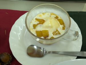 本校の調理師コースの教員の山本尚広より、西洋料理「クリスマス料理」をテーマに、「トマトときのこのエスカルゴソース」「鶏肉のコンフィ リゾット添え」「ピーチフランベ」を教わりました。