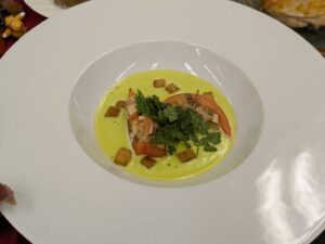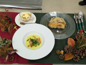 本校の調理師コースの教員の山本尚広より、西洋料理「クリスマス料理」をテーマに、「トマトときのこのエスカルゴソース」「鶏肉のコンフィ リゾット添え」「ピーチフランベ」を教わりました。