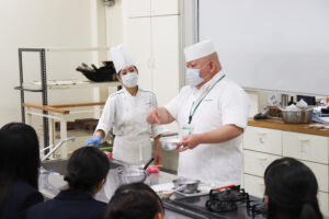 本校教諭による学校紹介や中学校と高校の違いについての話と喜志中学校の卒業生の話の後、体験授業をそれぞれ受け、施設見学をしました。その後、食堂にて食堂体験をしました。